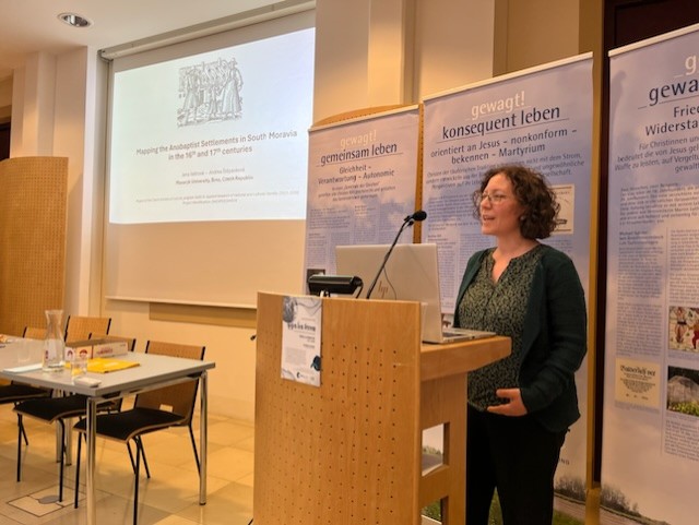 PhDMgr. Jana Valtrová, Professorin für Religionswissenschaften an der Masaryk Universität in Brünn/Tschechien und ihre Kollegin, Mgr. Andrea Štěpánková, Ph.D., beleuchteten die Entwicklung der Täufersiedlungen in Südmähren im 16. und 17. Jahrhundert und präsentierten neben Forschungsergebnissen auch die von ihnen entwickelte Datenbank, mit deren Hilfe rasch Orte, Namen und Zeitpunkte wichtiger Ereignisse der Täufergeschichte Südmährens (auf Rückfrage aus dem Publikum leider nicht darüber hinaus) miteinander in Verbindung gebracht werden können.