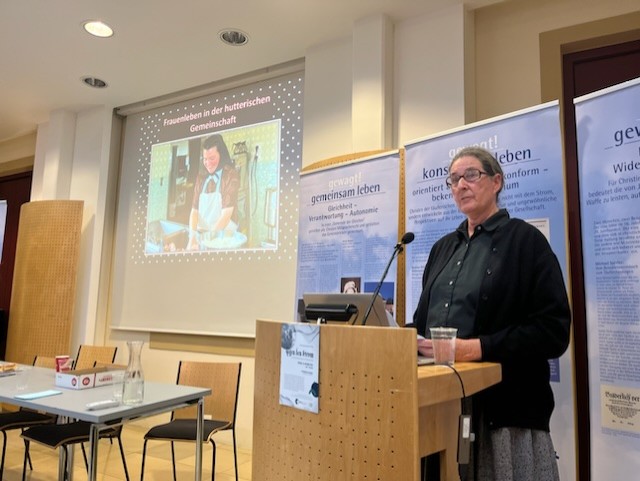 Emmy Maendel, Archivarin des historischen Archivs der Bruderhofgemeinschaft vom Bruderhof New York/USA, führte die Anwesenden nach einem bedrückenden Einblick in die, im 16. Jahrhundert mit Ertränkung, bestraften täuferischen Frauen zurück in die Gegenwart. Noch heute lebt die täuferische Gemeinschaft der Hutterer in einer Gütergemeinschaft, innerhalb der die Aufgaben zwischen Männern und Frauen klar geregelt sind. Sie hob hervor, dass die gelebte Tradition gerade in der heutigen Zeit den Mitgliedern der Hutterischen Gemeinschaft Sicherheit gebe und die Pflege der Nachbarschaftsbeziehungen einen hohen Stellenwert innehabe.
