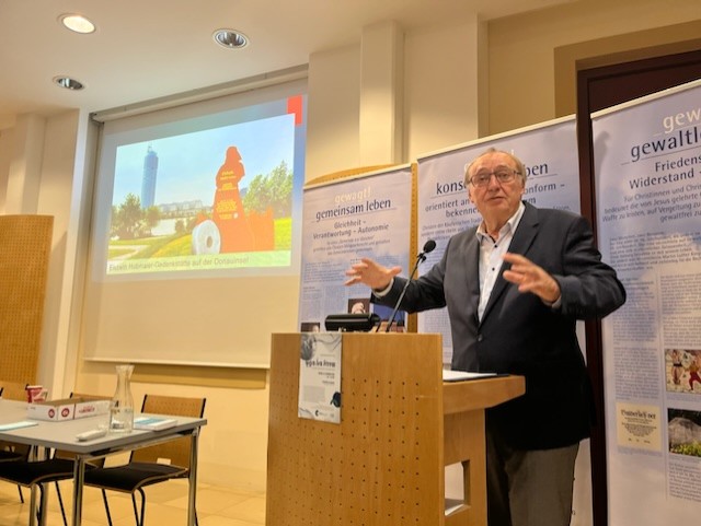 Ing. Reinhold Eichinger, Gründungsmitglied der Freikirchen in Österreich und u.a. Obmann des Hutterischen Geschichtsvereins, machte sich für eine gesunde Erinnerungskultur stark, welche in erster Linie „beschreibt, wie Gesellschaften mit ihrer Vergangenheit umgehen“. Sie träge zur Bildung von kollektiver Identität und zum Lernen aus der Geschichte bei. Das kostbare Erbe der Täuferbewegung müsse bei den Freikirchen stärker ins Bewusstsein treten. Eichinger stellte unterschiedliche Orte vor, an denen sich Täufergeschichte bereits visuell manifestieren konnte: die Gedenktafel an Balthasar Hubmaier am Stubentor/Wien, jene an Konrad Grebel, der zwischen 1515 -1518 in Wien studierte und als erster Glaubenstäufer der Neuzeit zum Vorläufer der freikirchlichen Bewegung wurde, oder auch die beeindruckende Errichtung der Galeere auf der Weinviertler Burgruine Falkenstein. Diese erinnert an die 150 Täufer, die damals in der Burg inhaftiert und zum Großteil 1540 zur Gallerenstrafe verurteilt wurden, was im Grunde genommen einer besonders grausamen Todesstrafe glich. „Die Besinnung auf die eigenen Wurzeln und der Mut, nicht mit sondern auch gegen den Strom zu schwimmen, sind wichtige Elemente der Freikirchen in der heutigen Zeit.“